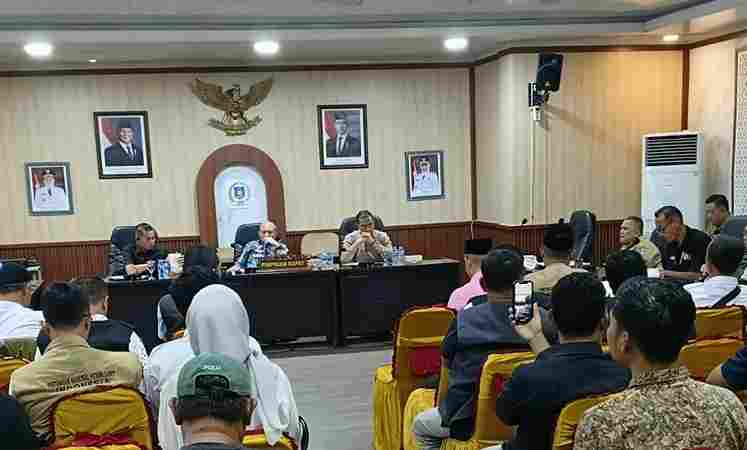 Sahurudin bersama ketua dan pengurus APKASINDO kabupaten di daerah ini datang ke gedung dewan memenuhi undangan DPRD untuk dengar pendapat terkait dinamika harga TBS, di ruang banmus DPRD Babel, Senin (20/4/2026). Hadir juga pimpinan beberapa Pabrik Kelapa sawit yang ada di Bangka Belitung.