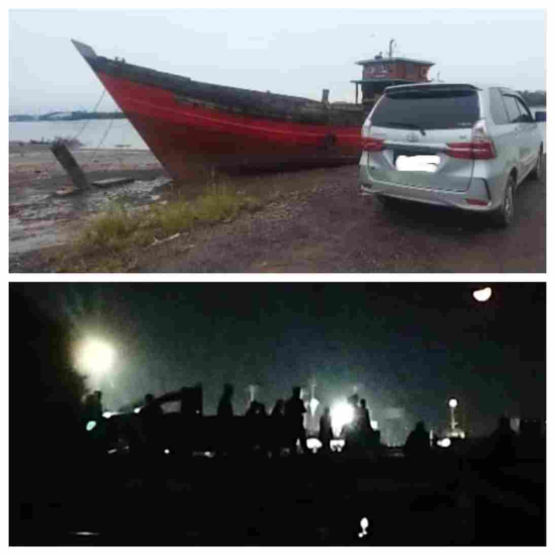 Gambar atas, Kapal Kayu Indah Jaya GT 34 muatan pasir timah yang kandas di Muara Pelabuhan Pangkal Balam, Jumat (30/5/2025). Gambar bawah, aktifitas pemindahan pasir timah dari kapal ke mobil pick up Hailux pukul; 23.15 WIB, Selasa tanggal 3 Juni 2025. (Foto suarapos.com)