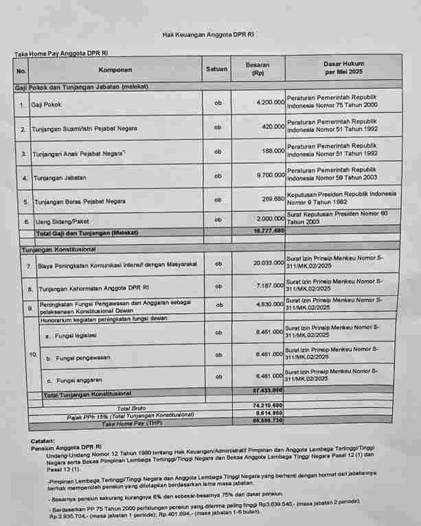 Demikian dikutip dari Keputusan Rapat Konsultasi Pimpinan DPR RI dengan Pimpinan Fraksi-Fraksi DPR RI, Kamis (4/9/2025), ditandatangani oleh jajaran pimpinan DPR RI. Yaitu, Puan Maharani selaku Ketua, Sufmi Dasco Ahmad sebagai Wakil Ketua, Saan Mustopa sebagai Wakil Ketua, dan Cucun Ahmad Syamsurijal selaku Wakil Ketua.