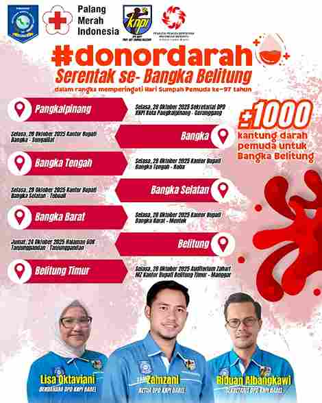 Kegiatan ini digelar serentak di enam kabupaten/kota, yakni Pangkalpinang, Bangka, Bangka Tengah, Bangka Selatan, Bangka Barat, Belitung, dan Belitung Timur. Aksi kemanusiaan tersebut menargetkan terkumpul 1.000 kantung darah hasil sumbangan para pemuda di seluruh Babel.
