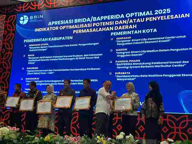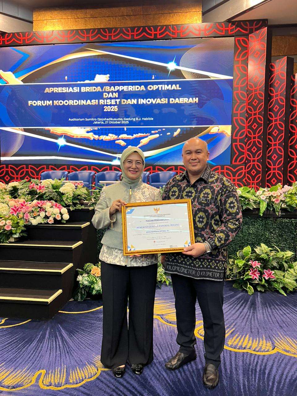 Penghargaan ini diberikan karena Pemkot Pangkalpinang dinilai terbaik mengenai kinerja BRIDA/BAPPERIDA Tahun 2025 yang digelar BRIN melibatkan lembaga riset dan inovasi daerah dari 24 provinsi, 187 kabupaten, dan 41 kota di seluruh Indonesia.