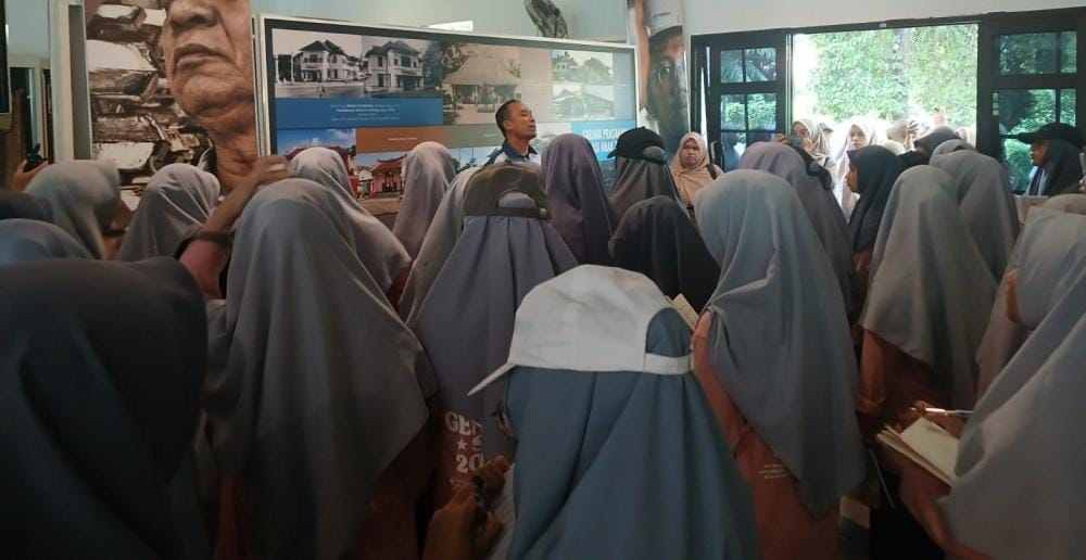 Para pelajar yang berkunung ke Museum Timah Mentok mendapat penjelasan tentang sejarah pertambangan timah di Bangka Belitung. (Foto timah.com)