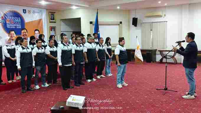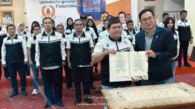 PANGKALPINANG — Ketua Komite Olahraga Nasional Indonesia (KONI) Bangka Belitung Ricky Kurniawan melantik dan mengambil sumpah pengurus KONI Pangkalpinang periode tahun 2026–2030 di Balai Betason, Kantor Wali Kota Pangkalpinang, Sabtu (25/4/2026).