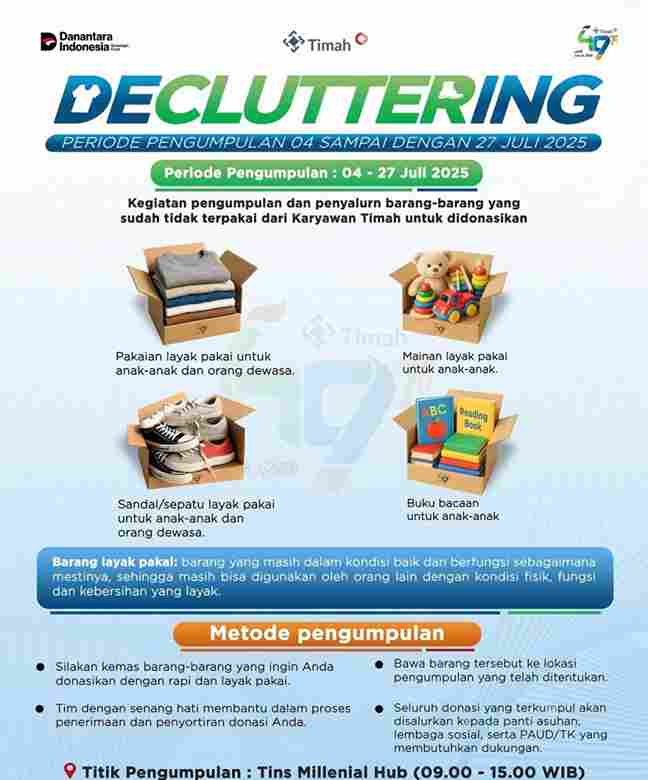 Decluttering merupakan bagian dari rangkaian HUT ke-49 PT Timah dengan tema ‘Untuk Merah Putih’ tidak hanya berfokus pada seremoni, tetapi juga menanamkan semangat berbagi dan kepedulian sosial di kalangan karyawan.