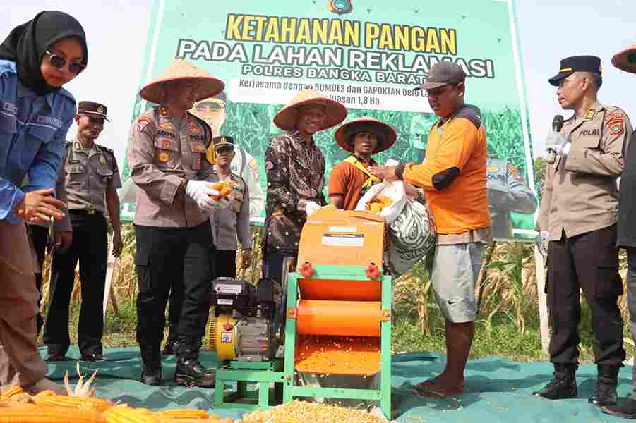 BANGKA BARAT – Polres Bangka Barat memanen jagung yang ditanam di lahan reklamasi di lingkungan Mapolres. Kegiatan ini menjadi bagian dari dukungan kepolisian terhadap program ketahanan pangan nasional sekaligus bentuk optimalisasi lahan yang sebelumnya tidak produktif.