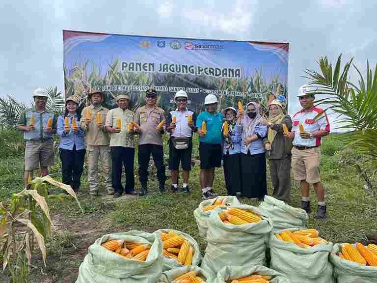 Kapolsek Kelapa Dahri Iskandar, S.H., bersama Forkopimda Kecamatan Kelapa dan Kadis Pertanian Bangka Barat melakukan panen perdana jagung di lahan PT. BPL Bukit Intan Estate Bangka Barat, Jumat (16/5/2025). (Foto Humas Polres Bangka Barat)